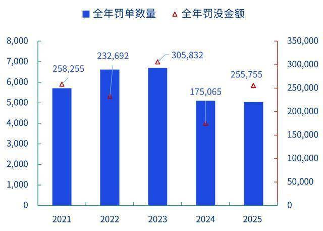 2025年,监管处罚高压态势持续不减,人民银行、金融监管总局、外管局(含总部及其派出机构)针对银行业金融机构及从业人员下发罚单5,036张,罚没金额共计人民币25.58亿元,从总体监管处罚趋势来看,2025年监管罚单数量较2024年同期基本持平,罚没金额较2024年同期有所上涨。