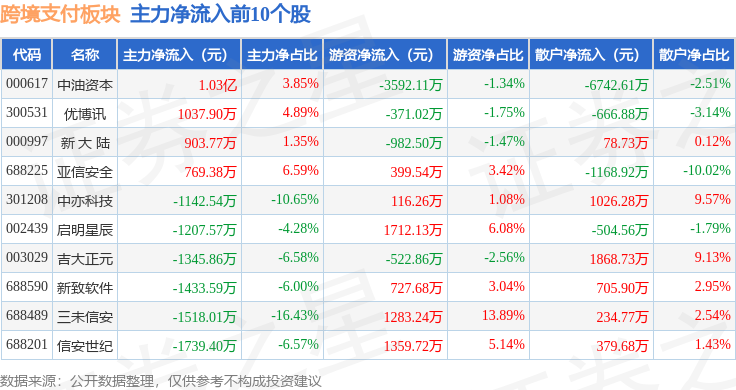 从资金流向上来看,当日跨境支付板块主力资金净流出23.78亿元,游资资金净流入6.01亿元,散户资金净流入17.77亿元。跨境支付板块个股资金流向见下表: