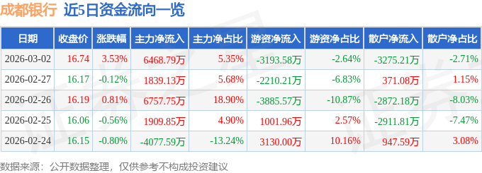证券之星消息,截至2026年3月2日收盘,成都银行(601838)报收于16.74元,上涨3.53%,换手率1.72%,成交量73.0万手,成交额12.09亿元。