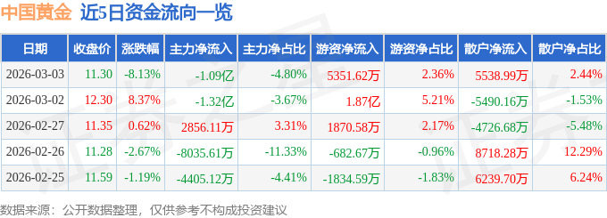 证券之星消息,截至2026年3月3日收盘,中国黄金(600916)报收于11.3元,下跌8.13%,换手率11.56%,成交量194.29万手,成交额22.68亿元。