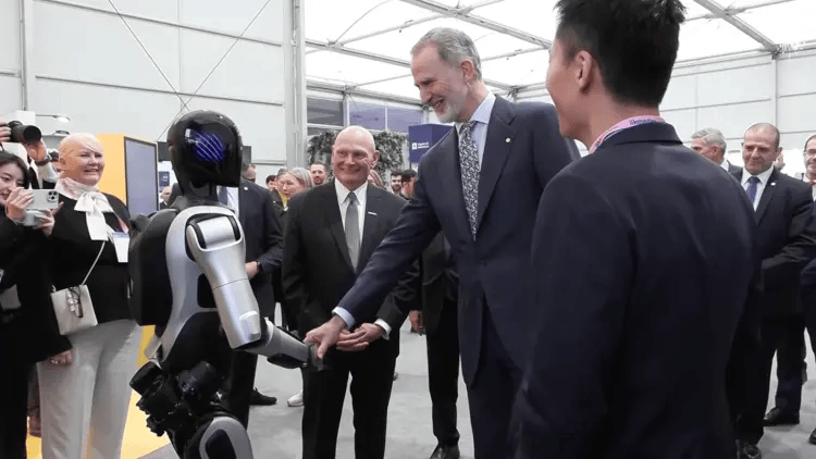 3月4日,中国具身智能企业智元机器人(AGIBOT)近日在巴塞罗那MWC 2026展出其通用机器人产品矩阵。展会首日,其人形机器人远征A2在未来机场展厅作为智能向导,接待了西班牙国王费利佩六世并完成全流程讲解。
