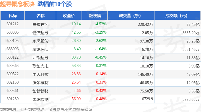 证券之星消息,3月4日超导概念板块较上一交易日下跌0.15%,白银有色领跌。当日上证指数报收于4082.47,下跌0.98%。深证成指报收于13917.75,下跌0.75%。超导概念板块个股涨跌见下表: