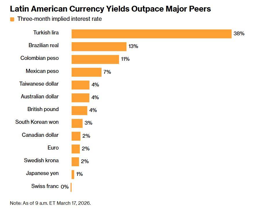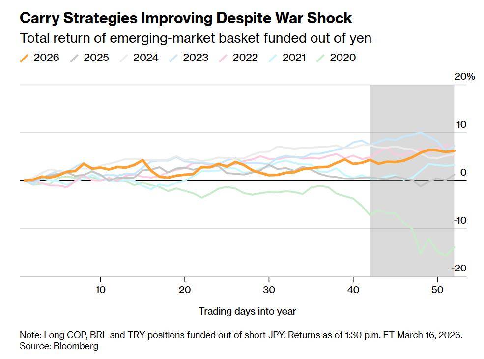 据彭博汇编数据显示,一种流行的做法是借入日元,买入一篮子货币,其中包括巴西雷亚尔、哥伦比亚比索和土耳其里拉。自美以发动对伊朗的袭击开始以来,该策略已获得超过2%的回报,今年以来回报率超过6%,为2023年以来最强开局。