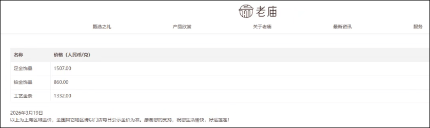 老庙黄金金饰克价1507元,较前一日1550元/克的价格 下跌43元/克,相比月内高点跌135元。