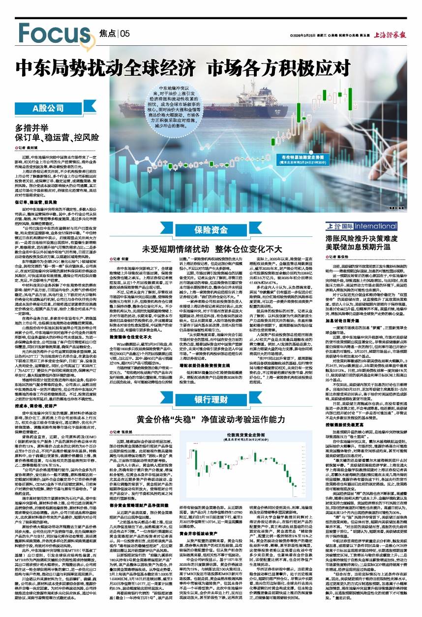 伦敦现货黄金走势图 (截至北京时间3月24日21时30分) 近期,随着国际金价波动明显加剧,部分挂钩黄金策略的银行理财产品净值出现阶段性回撤。此前被视作兼具避险属性与收益增强功能的“固收+黄金”类产品,正面临市场波动带来的新考验。 业内人士表示,黄金纳入理财投资组合,的确有助于提升资产分散度、增强组合韧性,但黄金本身并非低波动资产。尤其是在近期多资产价格联动波动、金价高位调整的背景下,黄金理财产品的短期净值波动有所放大,使得理财公司在产品设计、发行节奏和风控约束之间需进行重新权衡。 部分黄金策略理财产品净值回撤 从近期产品表现看,部分黄金策略理财产品已出现净值回撤。 “之前基本每天都是小幅上涨,但这几天净值连续往下走,虽然幅度不大,但还是有点不习惯。”一位在银行渠道购买黄金策略理财产品的投资者对记者表示。另一位投资者坦言,此前将该类产品视作“略有波动的稳健型理财”,但近期连续回撤让其开始重新评估产品风险。 以浙银理财发行的“琮融九溪添利180天持有2号黄金策略增强理财产品”为例,该产品整体以固收资产为底仓,并叠加黄金策略增强收益。从净值走势看,3月上旬该产品净值基本稳定在1.0205至1.0208区间,3月18日后连续回落,截至3月23日净值降至1.0177,近一周累计回撤约0.3%,波动幅度较此前明显放大。 再看招商银行代销的“招银理财嘉盈(稳金)一年持有日开1号”,该产品同样带有较强的黄金策略色彩。从近期表现看,该产品3月上旬净值维持在1.0780附近,随后自3月18日起连续下行,截至3月20日净值降至1.0734,近一周呈现震荡回落态势。 黄金并非低波动资产 从资产配置的逻辑来看,黄金与股票、债券等大类资产的相关性较弱,具有较强的分散配置价值。但从资产组合的实际效果来看,低相关性不等于低波动。 中金公司研报显示,基于1971年至2025年的日度数据估算,黄金价格波动率约为19%,与纳斯达克100大致相当,高于MSCI发达市场股票和MSCI新兴市场股票。也就是说,黄金虽然在极端风险事件中常被视为避险资产,但其本身并不是一个平滑型资产。此次中东地缘冲突发生以来,金价并未单边上行,反而出现波动放大,甚至阶段性下跌,这再次说明黄金价格同时受到美元、利率、地缘政治及交易情绪等多重因素影响。 南开大学金融学教授田利辉对上海证券报记者表示,在银行理财产品的配置资产中,真正构成收益基础的仍是固定收益资产,黄金通常是“辅助资产”,配置比例一般控制在5%至15%之间。黄金的波动会被债券等资产的稳定收益所平滑、稀释,甚至阶段性被掩盖,这使得投资者难以直观看出收益中有多少来自黄金,也意味着在金价急跌时,即便配置比例不高,也会对净值产生连续扰动。 华西证券在研报中提示,当前黄金隐含波动率已显著攀升,处于历史极高分位,短期仍需严控仓位。尽管从中长期看,美元信用边际弱化、全球央行去美元化等逻辑仍对黄金构成支撑,但本轮金价调整更像是前期快速上涨后的深度修正,后续修复可能需要较长时间。