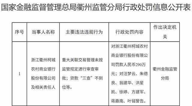 罚单信息显示,柯城农商行的主要违法违规事实为:重大关联交易管理未按监管规定进行审查审批;贷款“三查”不到位等。