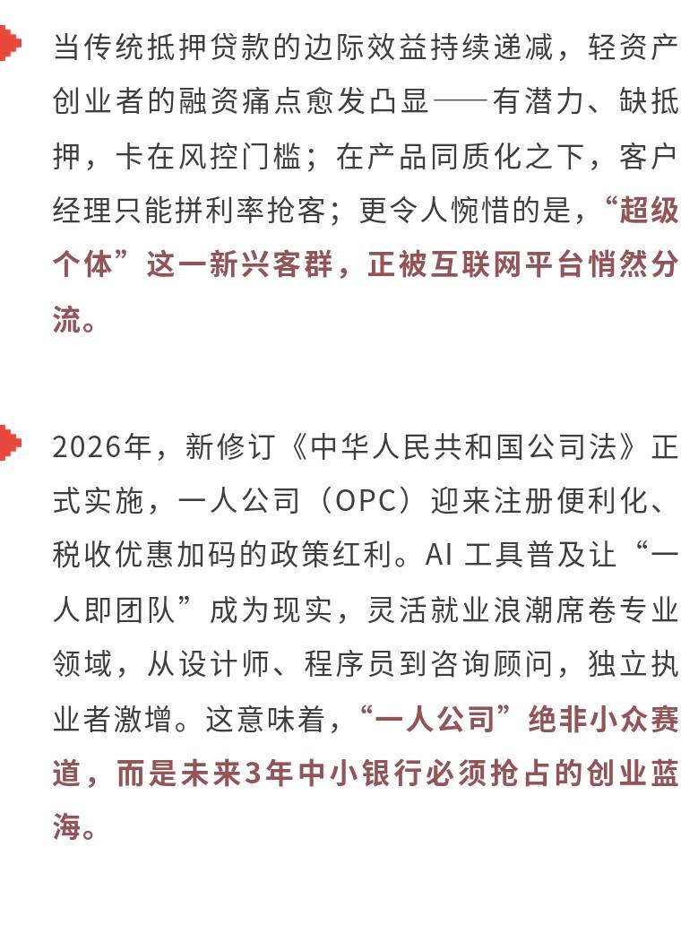 一人公司不是小微企业的缩小版,而是数字经济时代的新物种,是未来金融竞争的核心赛道。他们的核心资产是“人”与“数据”,核心需求是“全周期陪伴”,这与中小银行“深耕本地、服务小微”的定位高度契合。