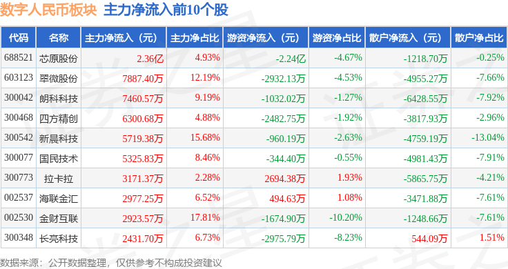 从资金流向上来看,当日数字人民币板块主力资金净流入1.27亿元,游资资金净流出4.37亿元,散户资金净流入3.09亿元。数字人民币板块个股资金流向见下表: