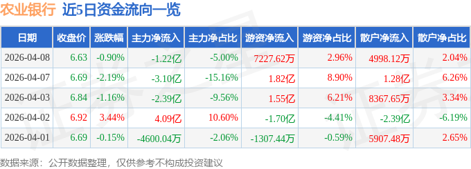 证券之星消息,截至2026年4月8日收盘,农业银行(601288)报收于6.63元,下跌0.9%,换手率0.12%,成交量370.88万手,成交额24.45亿元。