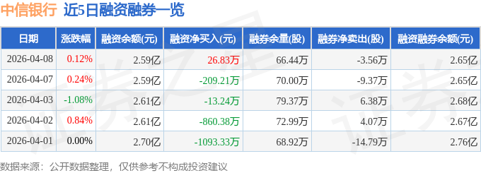中信银行融资融券信息显示,融资方面,当日融资买入1348.11万元,融资偿还1321.28万元,融资净买入26.83万元。融券方面,融券卖出8700.0股,融券偿还4.43万股,融券余量66.44万股,融券余额552.12万元。融资融券余额2.65亿元。