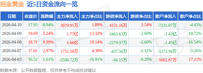 证券之星消息,截至2026年4月10日收盘,招金黄金(000506)报收于17.93元,下跌8.94%,换手率9.69%,成交量90.0万手,成交额16.33亿元。