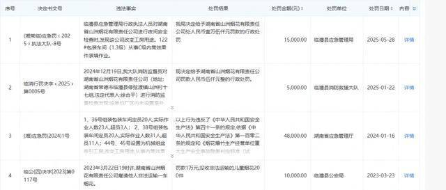 2025年1月,其因厂内未设置室外消火栓、厂区内灭火器配置不符合标准,被临澧县消防救援大队罚款5000元。2025年5月28日,也就是事发前19天,该公司因改变工房用途,在包装车间(1.3级)从事C级内筒效果件装填作业,被临澧县应急管理局罚款1.5万元。